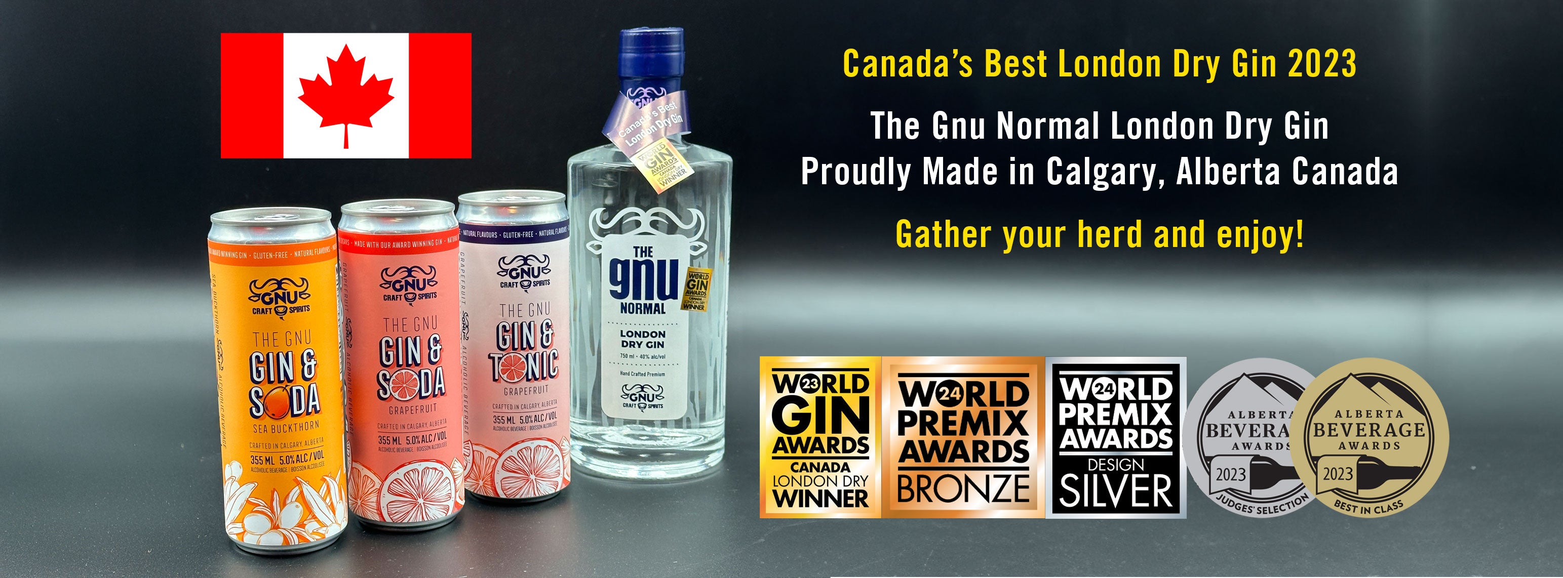 The Gnu Normal StoryWhen the pandemic hit, the new normal was an expression that was being thrown around more than masks and latex gloves. Since we were in denial that distancing ourselves from our loved ones and working in basements was the new normal, we decided to give the expression a whole new meaning by naming our first spirit, a London Dry Gin: The Gnu Normal. For us, the gnu normal means finding ways to (safely) connect no matter the circumstances: helping your neighbour shovel the sidewalk, sending family members from another province food from their favourite restaurant, having a drink with a friend (Even if it is a virtual cheers). The Gnu Normal London Dry Gin was created to be a go-to gin that the whole herd can enjoy. Every small batch is made with Western Canadian juniper berries, grains from the Alberta prairies, and sun-dried orange and grapefruit peel which elevates the fresh, citrus taste, making it perfect for a dry martini, G&T, or your favourite cocktail. The Gnu Normal Awards